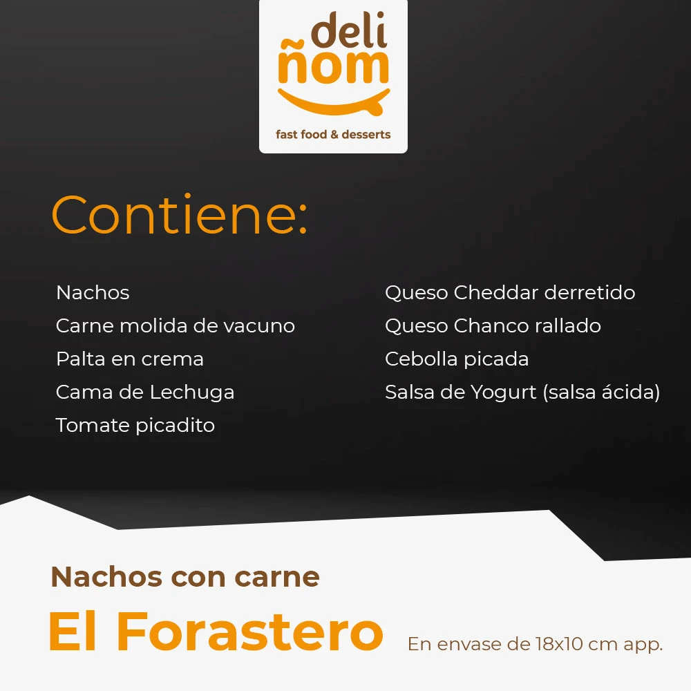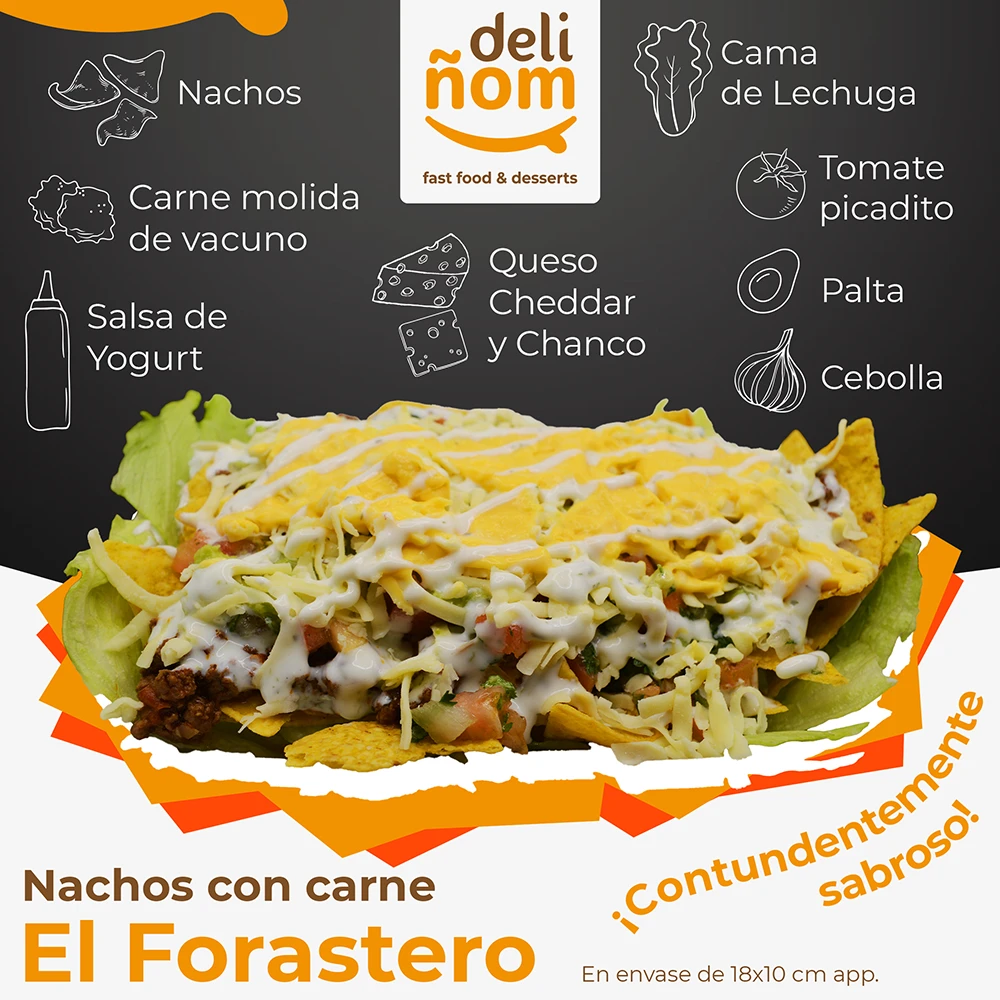Nachos en cama de lechuga con carne molida de vacuno, palta en crema, tomate picadito, cebolla picadita, queso chanco rallado, queso cheddar derretido y salsa de yogurt (salsa ligeramente ácida). Envase de 18×10 cm app.